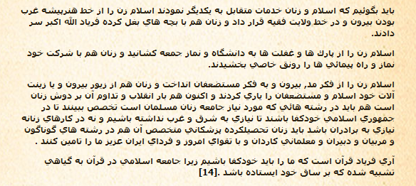 *آنوقت ها همسر شاه لباسی را که نامحرم دیده بود را دیگر نمیپوشید ولی این روزها در بازار که پا میگذاری اگر دختر باشی شرم میکنی از جلو یعضی مغازه ها حتی رد شوی در حالیکه فروشنده اش هم پسری جوان است.